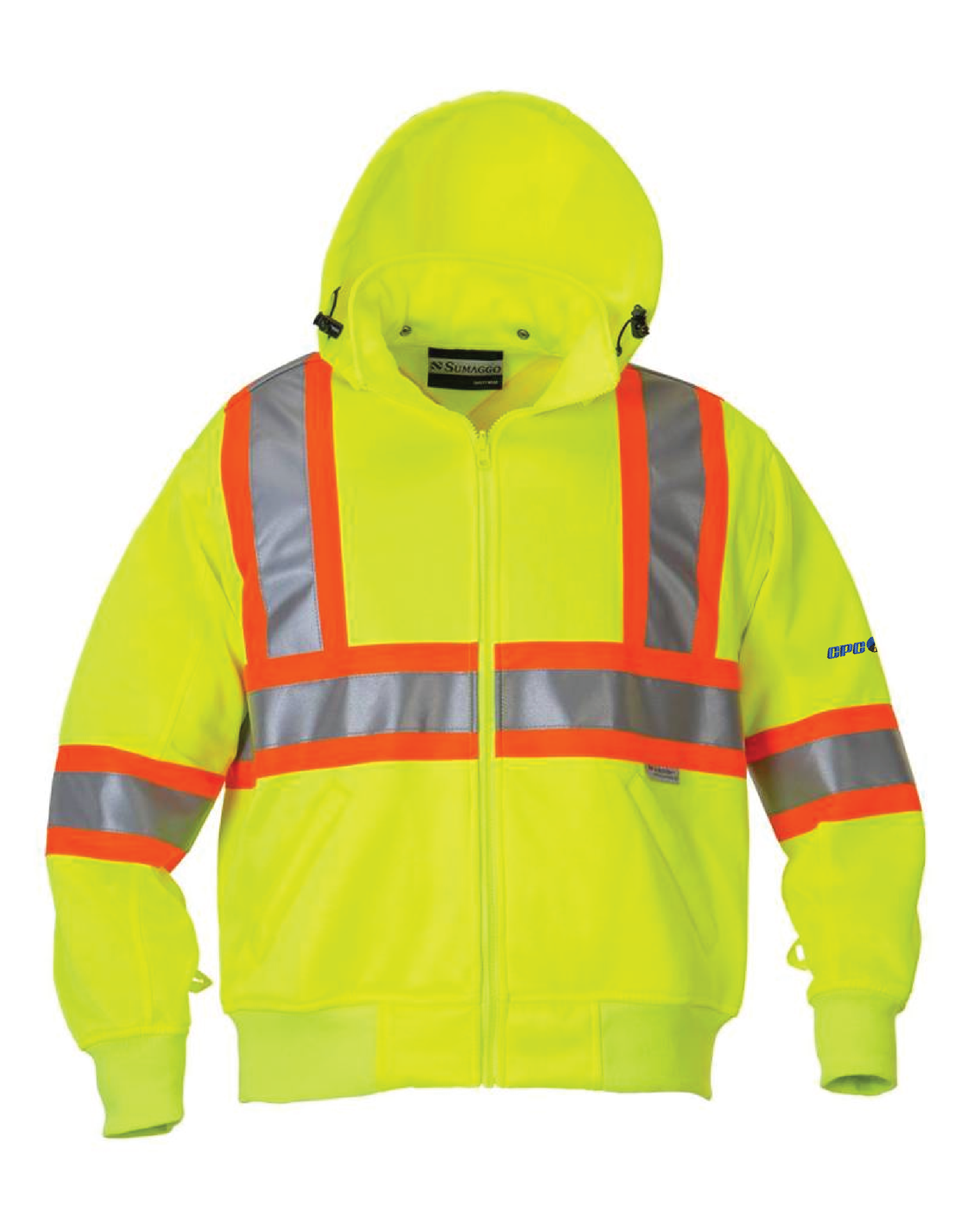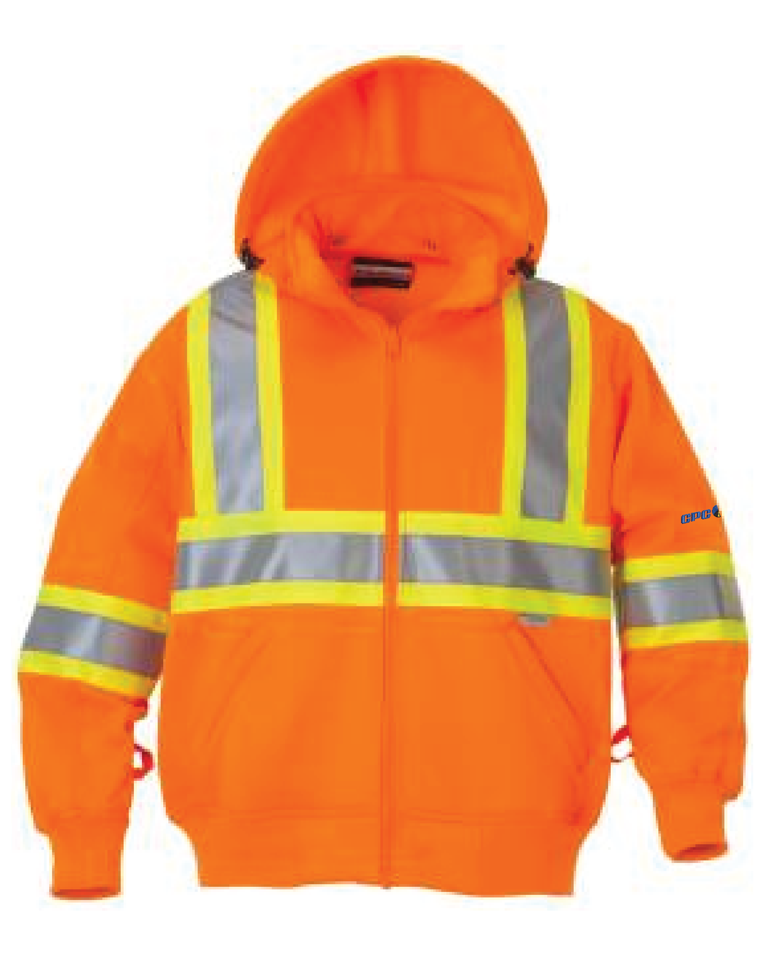 High Visibility fleece custom jacket with a reversible front zipper for zipping together and layering over other safety styles. Additionally for added comfort the hood is detachable for convenience.